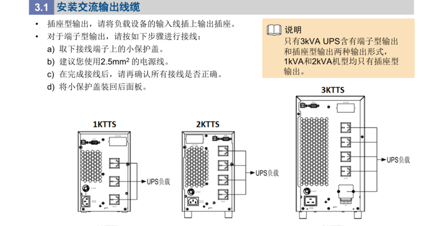 21. 安装操作设备时,必须使用完全绝缘的工具。2. UPS必须由厂家或其代理商认证的工程师进行安装、调试和维护,否则可能危及人身安全并且导致设备故障,由此引起的UPS损坏不属保修范围。1. 首先检查包装箱,检查UPS的包装是否完好无损,是否有明显压痕或者破损的地方。2. 打开UPS的包装,对照装箱清单,检查UPS的所有附件是否完整。3. 取出UPS,按照如图所示的方式将塔式UPS放置于平稳的安装面上。3安装线缆安装交流输出线缆 3.1• 插座型输出,请将负载设备的输入线插上输出插座。• 对于端子型输出,请按如下步骤进行接线:a) 取下接线端子上的小保护盖。b) 建议您使用2.5mm 2 的电源线。c) 在完成接线后,请再确认所有接线是否正确。d) 将小保护盖装回后面板。只有3kVA UPS含有端子型输出和插座型输出两种输出形式,1kVA和2kVA机型均只有插座型输出。