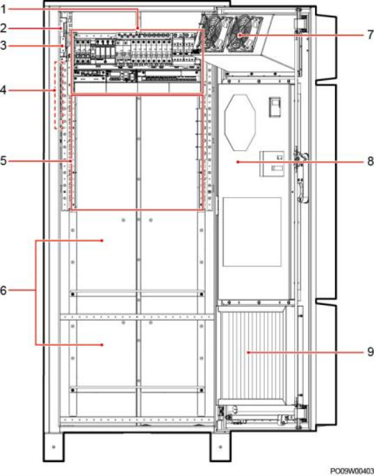 ( 1 )电源插框 (2)交流输出盒 (3)门磁传感器 (4)机柜接地排 (5)用户设备安装空间 (6)电池安装空间 ( 7 )外循环风扇 (8)PC1500H-3 (9)防尘网