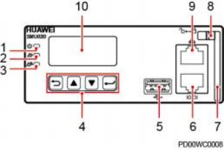 (1)运行指示 (2)次要告警指示灯 (3)重要告警指示灯 灯 (4)按键 (5)USB 接口(该端口支持安全保护机 (6)通信口 制) RS485/RS232 (7)把手 (8)拨销 (9)通信口 FE