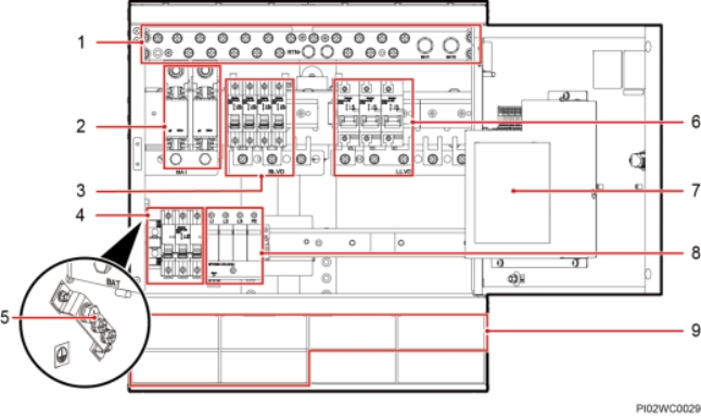(1)RTN+母排 (2)电池熔丝 (3)BLVD 空开