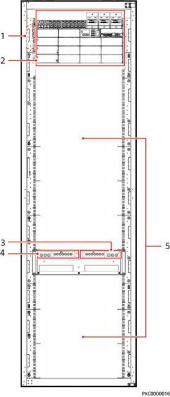 ( 1 )接地排 (2)DCDU-600AN1 (3)电池负极铜排 (4)电池正极铜排 (5)设备/电池安装空间